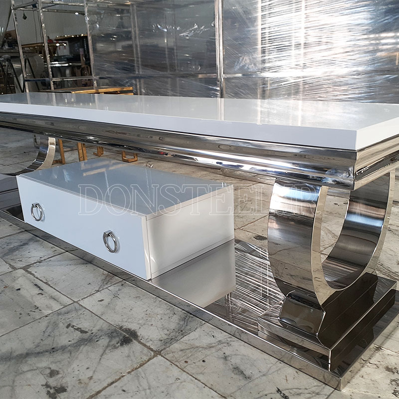 میز تلویزیون استیل مدل هلال از فروشگاه دون استیل، ترکیبی از طراحی مدرن و کیفیت ممتاز است که فضای نشیمن شما را زیباتر و منظمتر میکند. این میز از استیل ضدزنگ براق ساخته شده و در دو رنگ جذاب طلایی درخشان و نقرهای براق ارائه میشود. سطح براق و صیقلی آن نور را منعکس کرده و جلوهای لوکس به دکوراسیون میدهد.