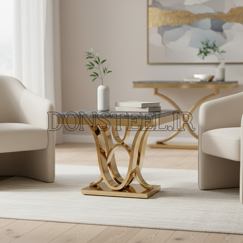 پایهی این میز عسلی با همان دقت و کیفیت، از استیل 304 ساخته شده و اتصالات آن با جوشکاری ظریف آرگون، کاملاً یکپارچه و تمیز به نظر میرسند. برای رنگ بدنه، دو گزینه جذاب طلایی و نقرهای (کروم) با تکنولوژی آبکاری PVD در دسترس است. این پوشش پیشرفته تضمین میکند که درخشش و جلای میز در برابر خط و خشهای روزمره و رطوبت، برای سالها مقاوم باشد.