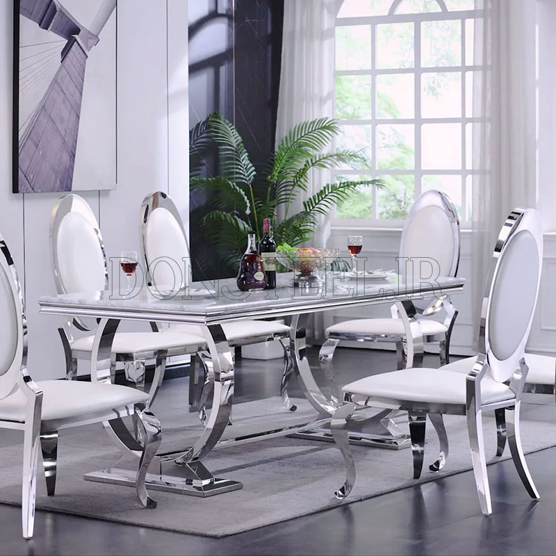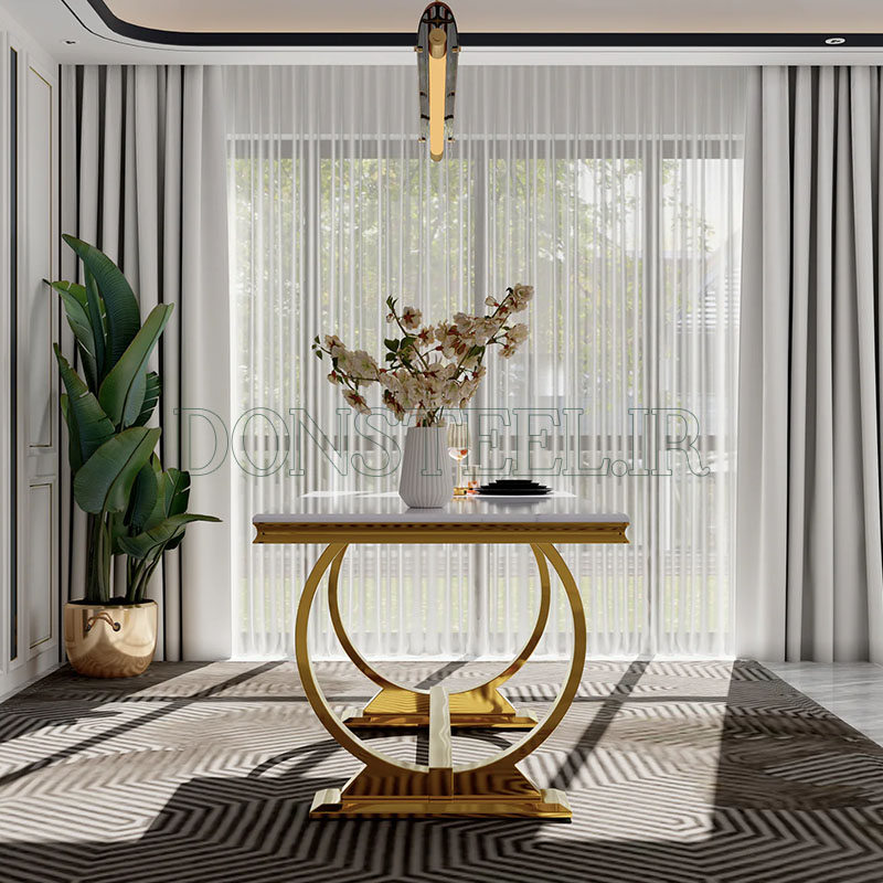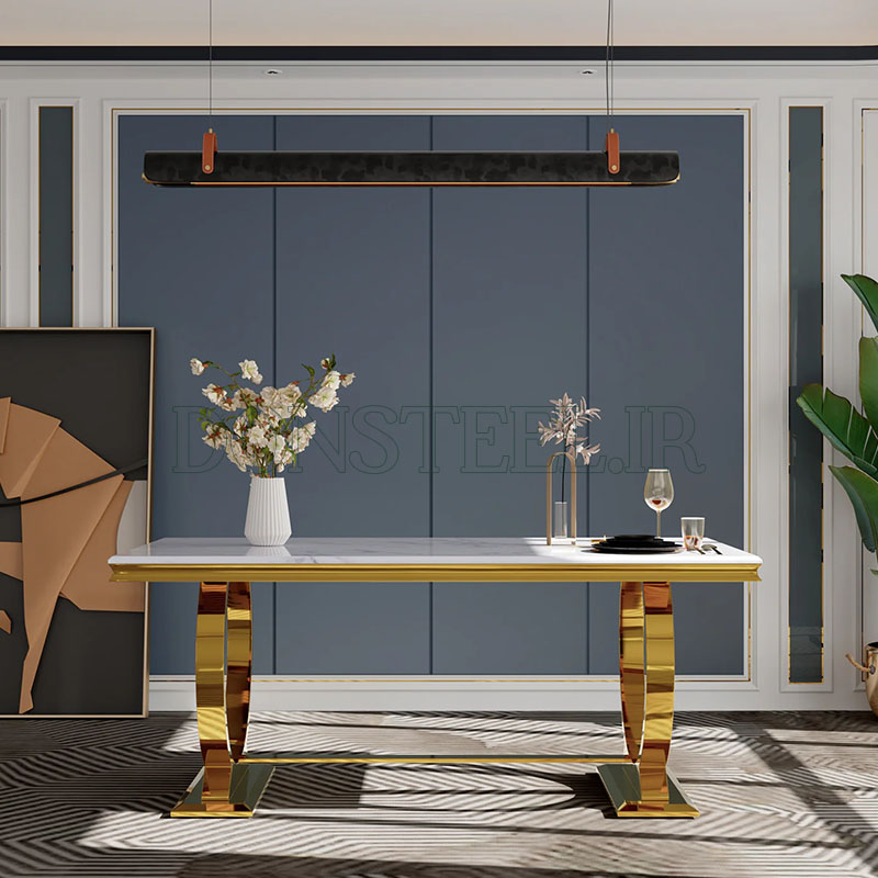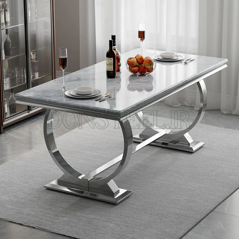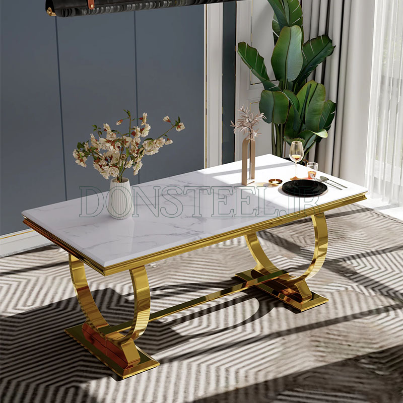 میز ناهارخوری استیل مدل هلال از فروشگاه دون استیل، ترکیبی از طراحی مدرن، کیفیت ممتاز و زیبایی چشمگیر است. بدنه این میز از استیل ضدزنگ با سطح براق ساخته شده که در برابر رطوبت و تغییر رنگ مقاوم است و دوام طولانیمدت را تضمین میکند. انتخاب رنگ طلایی درخشان یا نقرهای براق این امکان را به شما میدهد تا میز را با هر سبک دکوراسیونی هماهنگ کنید.