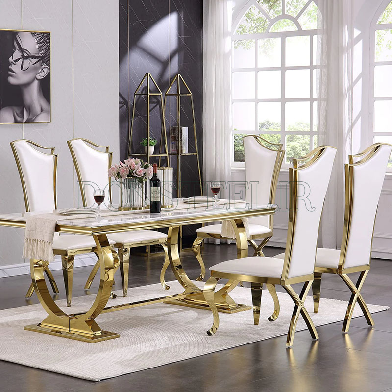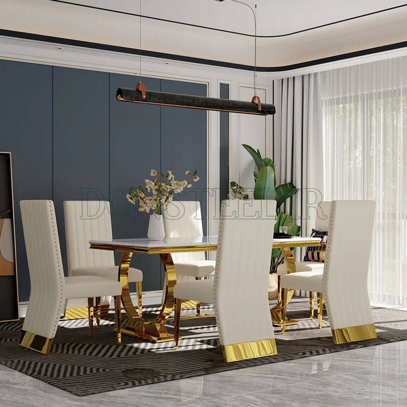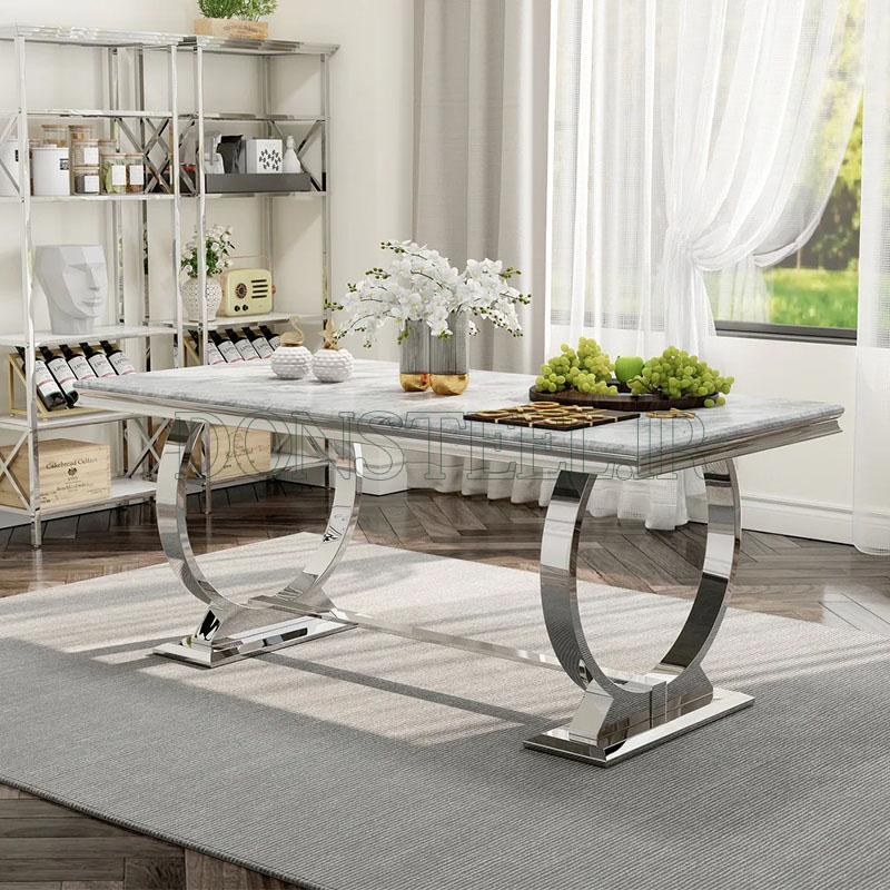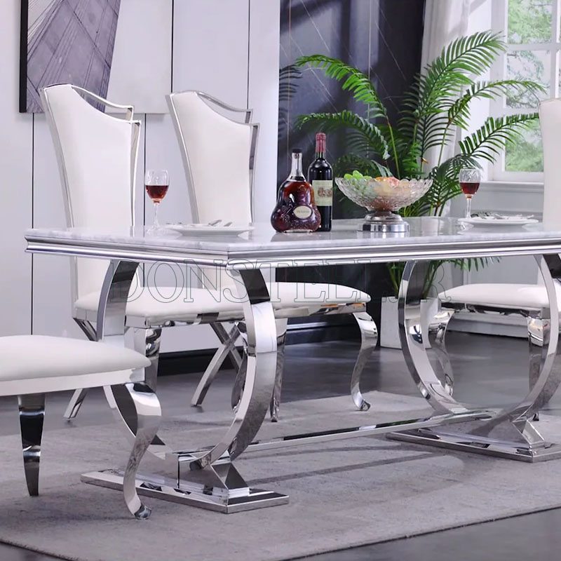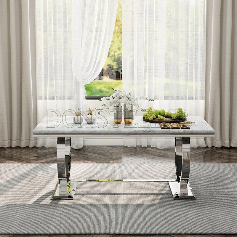 میز ناهارخوری استیل مدل هلال از فروشگاه دون استیل، ترکیبی از طراحی مدرن، کیفیت ممتاز و زیبایی چشمگیر است. بدنه این میز از استیل ضدزنگ با سطح براق ساخته شده که در برابر رطوبت و تغییر رنگ مقاوم است و دوام طولانیمدت را تضمین میکند. انتخاب رنگ طلایی درخشان یا نقرهای براق این امکان را به شما میدهد تا میز را با هر سبک دکوراسیونی هماهنگ کنید.